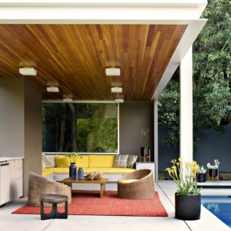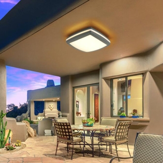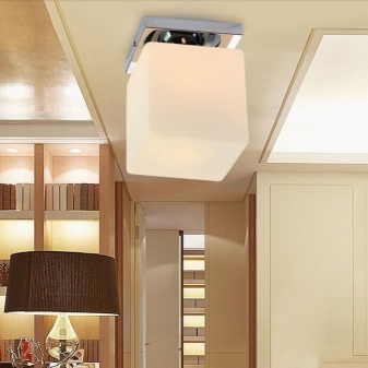لتزيين شرفة المراقبة أو الممر ، يمكنك استخدام ثريات سقف مربعة مع مصابيح LED. اختر مواد متينة حتى لا يفقد مصدر الضوء الجودة بمرور الوقت.