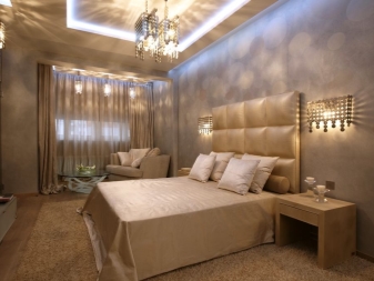 لتوفير الراحة للغرفة ، والتي ستساهم في الحصول على نوم لطيف وراحة مريحة ، يجب أن تفكر بعناية في الجزء الداخلي للغرفة. سوف يساعد الشمعدان في خلق الجو المناسب. كقاعدة عامة ، يتم وضعها فوق السرير. عند اختيار هذا العنصر ، تذكر أن أيًا من الزوجين يجب أن يكون قادرًا على إطفاء الضوء على جانبه من السرير بحرية. مصابيح الحائط فوق اللوح الأمامي مزخرفة.