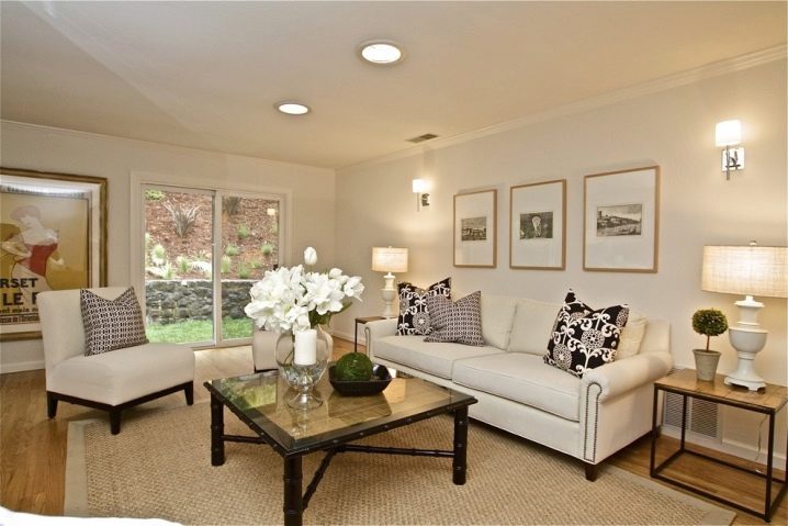 تبدو تركيبات الإضاءة جيدة على الحائط الذي توجد بالقرب منه الأريكة. فيما يتعلق بتحويل غرفة المعيشة ، يمكن أن يساعد الخيار مع مصابيح متعددة الألوان على الحائط. ستبرز تركيبات الإضاءة فوق الكرسي بذراعين مع طاولة القهوة هذه المنطقة.