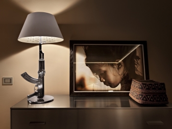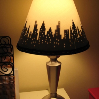 سيكون الحل المثير للاهتمام وغير القياسي هو تزيين عاكس الضوء الأسود الطويل والواسع بملصقات مختلفة ، ومقاطع من مجلات الموضة ، ونقوش مصنوعة يدويًا. هذا المصباح مثالي لغرفة المراهقين. إنهم يحبون فقط الانشغال بتزيين الأشياء ومنحهم أسلوبهم الفريد. سيذكرك مصباح الطاولة هذا دائمًا ببعض الأحداث الممتعة في الحياة ، ويجذب انتباه الضيوف ويسعد العين ويهتف.