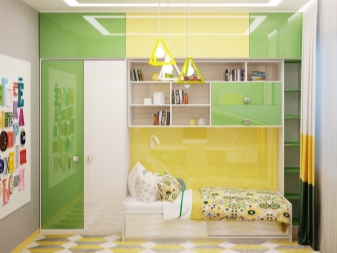 مجموعة من الألواح المشرقة هي حل شائع لغرفة نوم تلميذ. يمكن استخدامها أيضًا في مرحلة المراهقة ، فاللون الأصفر الملون لا يسمح للطفل بالملل في مثل هذه الغرفة. لا تخلق الثريا مستوى كافيًا من الإضاءة ، لذلك تم استكمالها بأضواء كاشفة وحلقة LED.