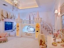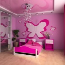 في غرف نوم الفتيات ، من الشائع استخدام النماذج الطويلة المعلقة المكونة من أشياء مختلفة. في هذه الحالة ، تتكون الثريا من زجاج جميل متعدد الألوان ، معلق بترتيب معين. على الرغم من أن الثريا طويلة بما يكفي ، إلا أنها بعيدة عن متناول الأطفال في سن ما قبل المدرسة.