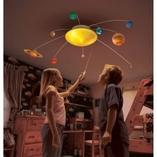 - إذا كانت الغرفة منمقة تحت موضوع “الفضاء” ، فبدلاً من الثريا بالمعنى الكلاسيكي ، يمكنك تنظيم هاتف متحرك ، حيث تكون الشمس أو كوكب الأرض هو عنصر الإضاءة المركزي ، وإما الكواكب الأخرى للنظام الشمسي أو القمر يدور حوله.