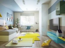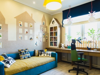 مجموعة من الألواح المشرقة هي حل شائع لغرفة نوم تلميذ. يمكن استخدامها أيضًا في مرحلة المراهقة ، فاللون الأصفر الملون لا يسمح للطفل بالملل في مثل هذه الغرفة. لا تخلق الثريا مستوى كافيًا من الإضاءة ، لذلك تم استكمالها بأضواء كاشفة وحلقة LED.