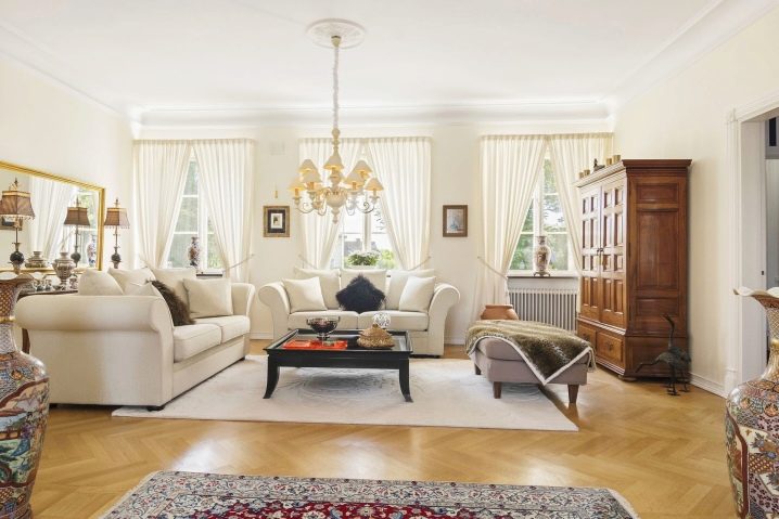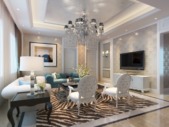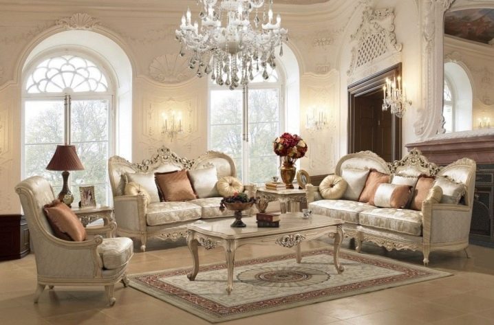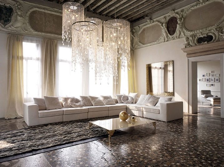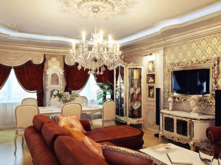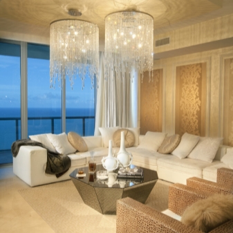 أثاث غرفة المعيشة مع عناصر الباروك – كلاسيكي حديث. في بعض الحالات ، تساعد الثريا في إنشاء صورة كاملة تمامًا عن الملوك والعظمة. اختر تصميمات الكريستال الضخمة أو الحديد المطاوع ذات الألوان الفاتحة. يمكن أن تكون المصابيح الكريستالية معلقة أو علوية ، الشيء الرئيسي هو اختيار خيار مع العديد من المعلقات المزخرفة ، ووفرة من التألق.