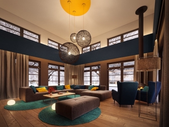 إذا كان ارتفاع الأسقف في الغرفة ملكيًا حقًا ، فيمكنك تثبيت تركيبة جماعية من المصابيح الخيالية المعلقة بأمان. سيخلقون المستوى المطلوب من الإضاءة ، بالإضافة إلى “إحكام” غرفة المعيشة بصريًا ، مما يضيف الراحة إليها.