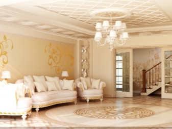 يمكن الحفاظ على فخامة الغرفة باستخدام مصادر الضوء المختارة بشكل غير عادي. لا تكتمل الثريا الكبيرة المهيبة بالمصابيح العادية ، ولكن على شكل شموع. جعلت تقنية مماثلة التصميم الداخلي ككل أكثر إثارة للاهتمام ، وملكيًا وفي نفس الوقت أكثر راحة..