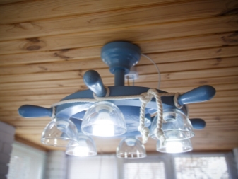 في دارشا ، لخلق الجو البحري الضروري ، سيكون من الأكثر نجاحًا غلق الجدران بالخشب ، ووضع كرسي هزاز ، وشبكات تعليق ، واختيار ثريا كلاسيكية. بالطبع ، في هذا السياق ، من خلال ثريا كلاسيكية على شكل عجلة القيادة ، فإننا نعني حافة خشبية بست درجات ومصابيح مدمجة للإضاءة. في مثل هذا التصميم الداخلي ، ستبدو ثريات السقف والجدران جميلة. غالبًا ما تكون ثريات السقف ذات الطراز البحري ثقيلة جدًا ، لذا يجب الانتباه في المنازل الريفية إلى موثوقية السحابات..