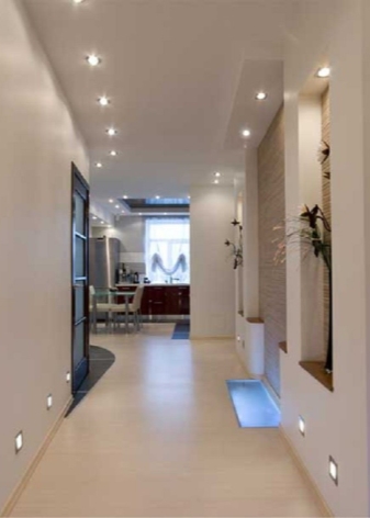 تحتاج الغرفة الخالية من الضوء الطبيعي ، مثل الممر ، إلى أكبر عدد ممكن من مصادر الإضاءة الإضافية. لكن تجدر الإشارة إلى أن عدد المصابيح يعتمد أيضًا على قوتها وخصائص الإضاءة. تعد مصابيح الفلوريسنت أكثر سطوعًا من المصابيح التقليدية ، لذلك إذا تم استخدامها ، يمكنك التعامل مع عدد أقل من تركيبات الإضاءة..