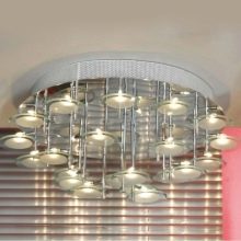 مناسبة لغرفة المعيشة الصغيرة ذات الأسقف المنخفضة ثريات السقف ذات الظلال الصغيرة والديكور. في الوقت نفسه ، ستبدو المصابيح ذات الشكل واللون الأصليين مناسبة. عندما تكون غرفة المعيشة ممدودة ، من الضروري شراء العديد من تركيبات الإضاءة. لإضاءة غرفة بشكل كامل ، تحتاج إلى جهازين على الأقل. يمكن أن يكون ثريا ومصباحًا ، ثريتان (من نفس الحجم أو بحجم مختلف).