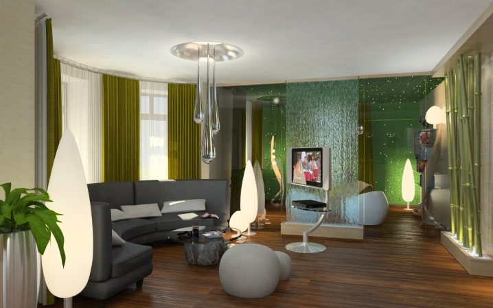 بشكل عام ، تتميز تركيبات إضاءة غرفة المعيشة بأسلوب حديث بمواد غير عادية ، وتصميم أصلي ، وتعدد الاستخدامات. يتم تتبع هذه الميزات جيدًا في النمط البيئي للداخل. نظرًا لأن أساس هذا النمط هو الطبيعة والسطوع ، يمكن صنع الثريا من مواد طبيعية (خشب ، زجاج) ، ذات شكل غير عادي وألوان طبيعية..