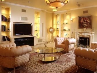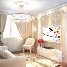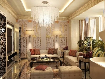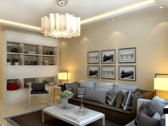 مناسبة لغرفة المعيشة الصغيرة ذات الأسقف المنخفضة ثريات السقف ذات الظلال الصغيرة والديكور. في الوقت نفسه ، ستبدو المصابيح ذات الشكل واللون الأصليين مناسبة. عندما تكون غرفة المعيشة ممدودة ، من الضروري شراء العديد من تركيبات الإضاءة. لإضاءة غرفة بشكل كامل ، تحتاج إلى جهازين على الأقل. يمكن أن يكون ثريا ومصباحًا ، ثريتان (من نفس الحجم أو بحجم مختلف).
