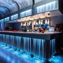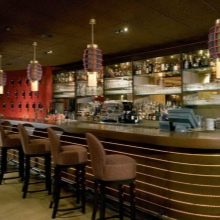 - تم إنشاء ديكور الردهة باستخدام ظلال كروية فاتحة ، بما في ذلك فوق البار.
