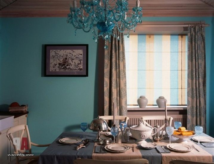 أصبح الديكور الداخلي الفيروزي أحد الحلول العصرية لغرف المعيشة في السنوات الأخيرة ؛ فهم يحبون اختيار الثريات الفيروزية لذلك. لذلك ، يمكنك بسهولة العثور على ثريا لأي نمط داخلي. ولكن بشكل خاص ، سوف يتناسب هذا العنصر مع الكلاسيكيات الحديثة..