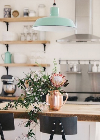 سيضيف التصميم الداخلي بألوان النعناع نضارة إلى المطبخ ، وستتناسب الأزهار والباقات تمامًا معه ، ويمكن أن يكون مصباح نسيم البحر بسيطًا بشكل لا يصدق وفي نفس الوقت بهيج.