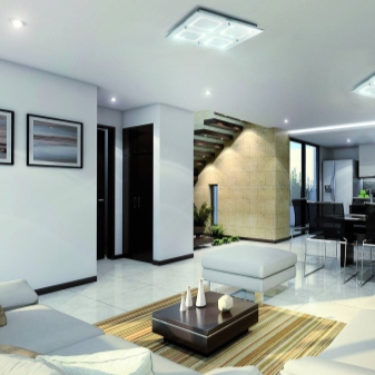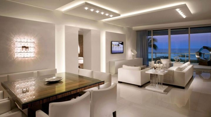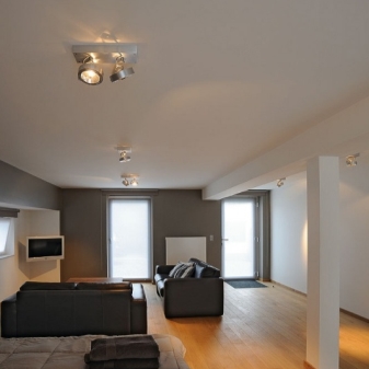 فكر في تصميم التركيب. بالنسبة للغرف الفسيحة ذات الأسقف العالية ، يُنصح بإعطاء الأفضلية للنماذج العلوية غير العادية ، لأنها تنوع المساحة الداخلية وتخفي المساحة بصريًا قليلاً ، مما يجعل الغرفة أكثر راحة. بالنسبة للغرف الصغيرة ، يُنصح باختيار إضاءة مدمجة صغيرة تتناسب مع لون الأسقف. لن يكون للهياكل غير المرئية أي تأثير على المظهر العام للغرفة ، ولكنها ستخلق فقط المستوى المطلوب من الإضاءة.