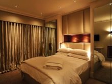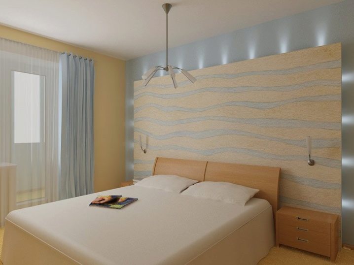 في غرفة النوم ، السرير هو العنصر الداخلي الرئيسي ، ويجب عليك بالتأكيد إبرازه بطريقة ما. في هذه الحالة ، ابتكر المصممون إضاءة غير عادية للوح الأمامي ، ووضعوا المصابيح حول محيطها. الإضاءة الخلفية لها مفتاحها الخاص ويمكن إضاءتها بشكل منفصل عن الضوء العلوي ، مما يمنح الغرفة تميزًا.