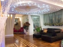 سقف “السماء المرصعة بالنجوم” – خيار رائع لغرفة المعيشة. تتطلب هذه الإضاءة تركيب مصادر إضاءة إضافية ، وهنا يتم استكمال إضاءة السقف بنقطة LED مثبتة حول محيط الغرفة بالكامل. لاحظ كيف يتم تمييز المنافذ بشكل جميل. بمساعدة الأضواء الكاشفة المخبأة فيها ، كان من الممكن خلق وهم الضوء ، كما لو كان يتدفق من أي مكان..