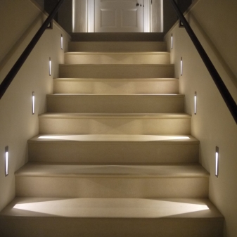 سيؤدي تركيب الإضاءة على طول الدرج إلى التخلص من الحاجة إلى تشغيل الضوء العلوي في الليل إذا كنت ، على سبيل المثال ، تنزل إلى الطابق السفلي لشرب كوب من الماء. حل اقتصادي وذكي للمنازل الكبيرة.