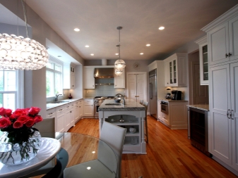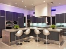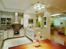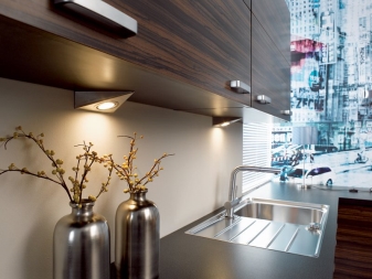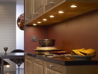 في المطبخ ، يتم تثبيت الإضاءة أحيانًا تحت خزائن الحائط أو في السقف على طول منطقة العمل. من الشائع أيضًا تثبيت المصابيح المدمجة في الخزانات ذات الأبواب الزجاجية ، عند فتحها ، يتم تشغيل الضوء تلقائيًا.