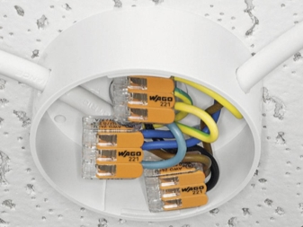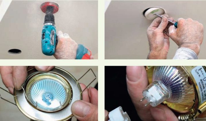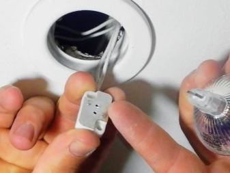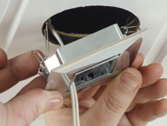 إذا تم عمل الفتحة ، يمكن توجيه السلك. ثم يمكنك البدء في تثبيت المصباح نفسه. يتم تثبيته عن طريق محلاق خاص مع نوابض ، والتي يجب تجميعها وإدخالها في شعاع القطع ، وبعد ذلك يتم تفريقها وتثبيت المصباح. (للراحة ، يمكنك تثبيت الهوائيات مع سلك خاص ، يتم قطعه لاحقًا بملقط في السقف).