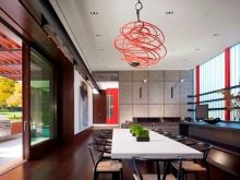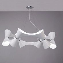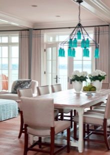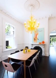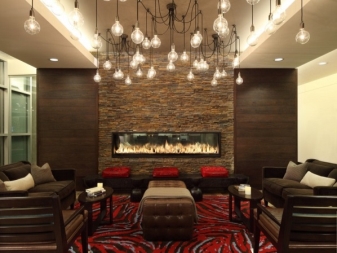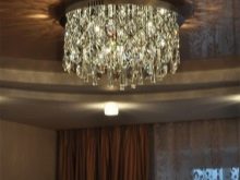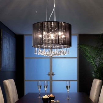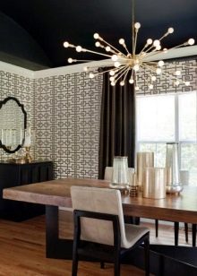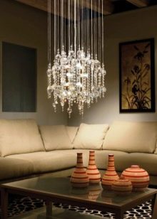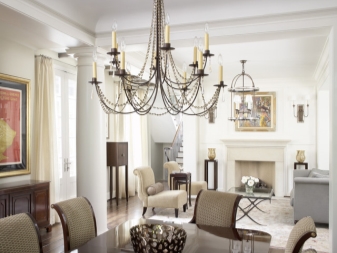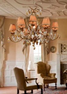 بالإضافة إلى ذلك ، بمساعدة ثريات السقف المعلقة ، من الممكن إضاءة أكبر الغرف بفضل التأثير المنتشر. عادة ما يكون تصميم هذا الجهاز ثلاثة مصابيح أو أكثر بقوة 300 واط لكل منها..