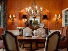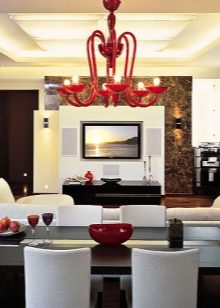 - ستبدو المنسوجات ذات الألوان الداكنة مع الثريا الكريستالية الحمراء جميلة جدًا وغير عادية وأصلية. يمكن أن يكمل هذا التكوين مصباح طاولة مع توهج دافئ..