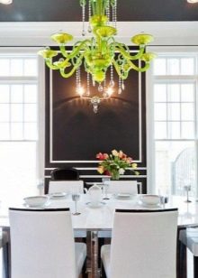 ستضيف الثريا الخضراء الفخامة والأناقة إلى الغرفة. لكن لا يتم دمجها مع جميع ألوان ورق الحائط والعناصر الداخلية ، لذلك يجب أن تكون حذرًا معها. الصبغة الأقل شيوعًا هي اللون الأصفر: كل ذلك بسبب عدم تعبيرها. ولكن في بعض الحالات ، يمكن أن تبدو جيدة أيضًا..