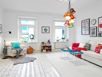 - بالنسبة لغرفة بسيطة بيضاء تمامًا ، سيكون التصميم مع العديد من الظلال متعددة الألوان: البرتقالي والأحمر والأخضر زخرفة ممتازة. ستعمل أي ألوان من ألوان قوس قزح ، خاصةً إذا قمت بدمجها مع نفس غطاء الوسائد أو ، على سبيل المثال ، سجادة مرقعة..