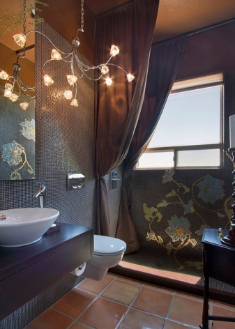 - يمكن إضاءة الحمام على الطراز الهندي بثريا بعناصر من الحديد المطاوع وشموع لاكونية ، مما يدعم تصميم المصباح بإضاءة إضافية على شكل شمعدانات جدارية موضوعة بشكل متماثل على جانبي المرآة.
