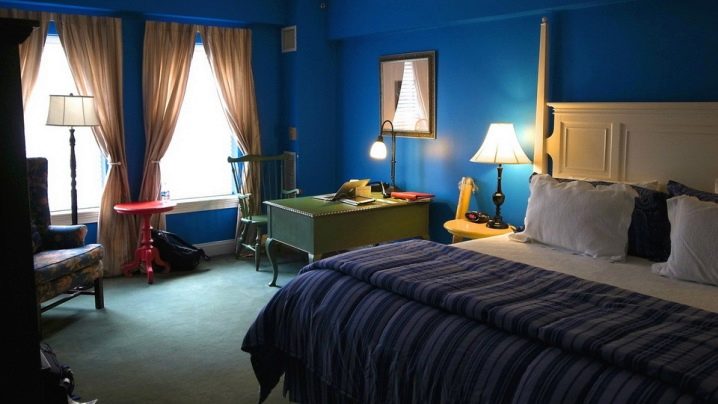 بالنسبة للقاعة أو غرفة الاستراحة ، فإن اللون الأزرق الداكن والأحمر والطوب مناسب. هذه هي بالضبط الظلال التي تغلف الداخل بنعومتها وفي نفس الوقت جرأتها..