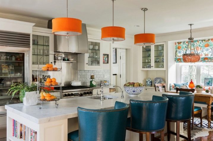 ستكمل الثريات البرتقالية والقرمزية بشكل مثالي التصميم الداخلي لمطبخك أو غرفة المعيشة. هذه الألوان ، كما وجد العلماء ، تسبب الشهية وتتناسب بشكل جيد مع أدوات المائدة ، وتنعكس فيها وتعطي ظلًا “لذيذًا” للغرفة..