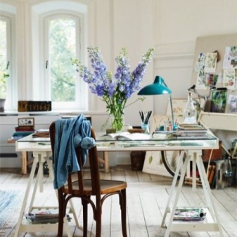 تعتبر الظلال الزرقاء أكثر ملاءمة لخلق جو عمل ، لذا يكون مكانها في المكاتب أو غرف الدراسة. لكن لا يجب عليك اختيار مصابيح من هذه الظلال ذات الأحجام الكبيرة ، وإلا سينخفض الأداء..