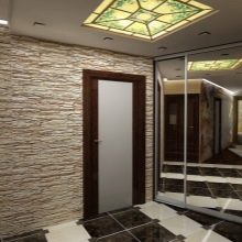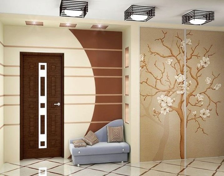 في قاعة المدخل المشرقة مع خزانة ملابس كبيرة مزينة بملصق فينيل في المفتاح الياباني ، ستبدو مصابيح السقف متعددة الطبقات بإطارات مربعة سوداء ، بالإضافة إلى المصابيح الصغيرة المريحة فوق باب المدخل ، جذابة للغاية..