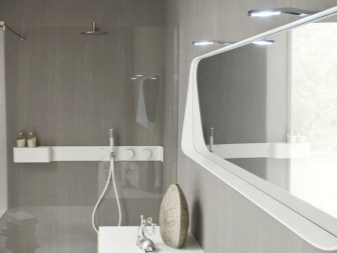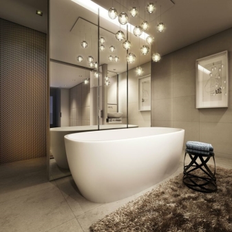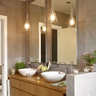 الاختيار لصالح هذا التكوين أو ذاك يقتصر فقط على خيال صاحب الحمام. من المهم مراعاة الغرض الوظيفي وموقع المصباح من أجل اختيار خيار الشكل الأنسب..