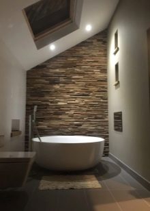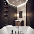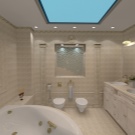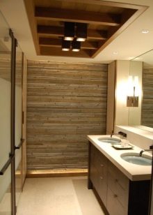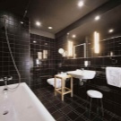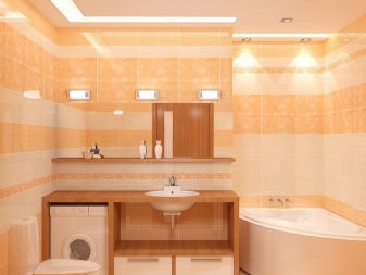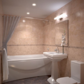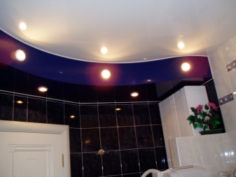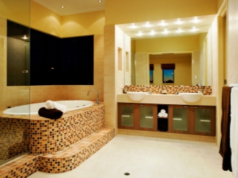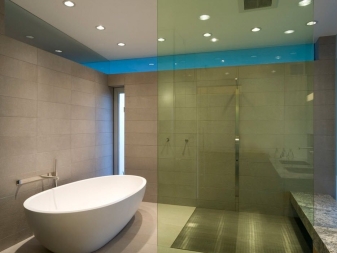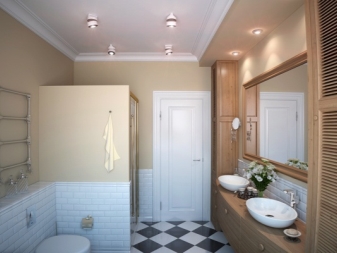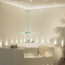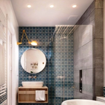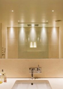 - في الحمامات منخفضة الارتفاع والمجهزة بسقف ممتد ، من الأفضل استخدام الأضواء الكاشفة المدمجة. لن يشغلوا مساحة كبيرة ولن يلفتوا الانتباه إلى أنفسهم وسيخلقون مستوى كافيًا من الإضاءة في الغرفة. يُنصح بتجهيز المرآة بمصابيح إضافية لا تسمح بمرور الماء.