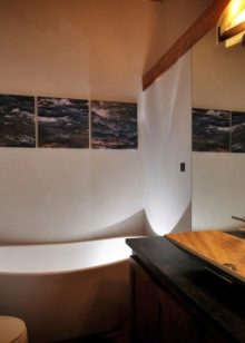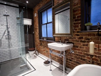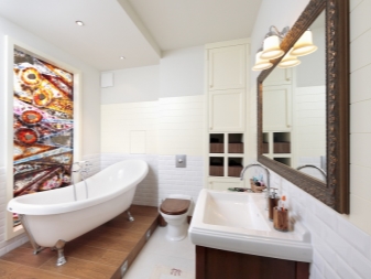 - في غرفة ذات منافذ ، سيكون الحل الجيد هو إنشاء الإضاءة الخاصة بهم. لذلك تم تغيير الحمام بالكامل ، يظهر وهم غرفة كبيرة ، والتي تستمر إلى ما بعد المنافذ. من الضروري أيضًا التركيز على التفاصيل ، على سبيل المثال ، الأشياء المخبأة في منافذ أو مرايا..