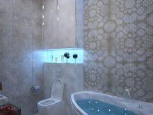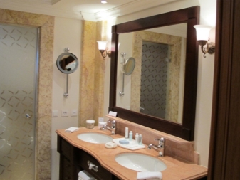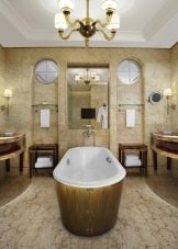 - تبدو هياكل الإضاءة الأصلية مثيرة للاهتمام وقديمة الطراز بطريقة جيدة. اختار المصمم الثنائي المثالي من ثريا مثبتة في السقف وشمعدانات شبحية. يمكنك أن ترى أن هناك مفتاحين بجوار الحوض: أحدهما للضوء العلوي والآخر للشمعدان. من الأفضل عدم استخدام المفاتيح في هذا المكان ، إذا تسرب الماء إليها ، فقد تحدث دائرة كهربائية قصيرة.