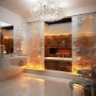 يجدر الانتباه هنا ليس إلى مصابيح السقف ونموذج الجدار بقدر الاهتمام بالوعة المضيئة. مثل هذا الحل غير عادي للغاية ولن يتناسب مع كل الأجزاء الداخلية ، ومع ذلك ، في هذه الحالة بالذات ، فإن الحوض المضيء هو اللكنة الرئيسية للغرفة بأكملها..