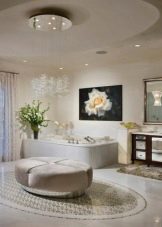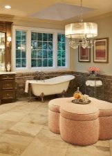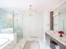 عند الحديث عن الحمامات الكبيرة ، لا يسع المرء إلا أن يذكر الاتجاه العصري للغاية – استخدام الثريات المعلقة في التصميم. يمكن أن تكون على شريط لتعديل الارتفاع ، أو معلقة علوية أو عادية. كقاعدة عامة ، هذا الابتكار مناسب فقط للديكورات الداخلية الحديثة. تم تحويل الغرف ، المكملة بالثريا المعلقة ، بالكامل. تبدأ الغرفة العملية مثل الحمام فورًا في إعطاء انطباع بزاوية مريحة وفخمة..
