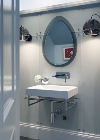 - على الرغم من اللمسة القديمة ، لا يزال الحمام حديثًا بفضل الاختيار الكفء لمصابيح المرايا. جعلها تصميمها البسيط واستخدام المواد الفاخرة تفاصيل مهمة في هذه الغرفة. إنها ليست محمية من الماء ، لذلك قام المصممون بفصلهم بكفاءة عن الرش بقسم زجاجي..