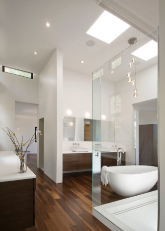 - في هذه الحالة ، يتم استخدام الضوء بطريقة محسوبة ويعمل على خلق جو خاص. ضوء الشموع الناعم يتناغم مع إضاءة منطقة المرآة. وحدات الإنارة الموضعية التي تخلق تيارات اتجاهية من الضوء تضيء بشكل كافٍ باقي المنطقة. استخدام الإضاءة المدمجة مباشرة في الحمام يجعل الغرفة ممتعة وحديثة.