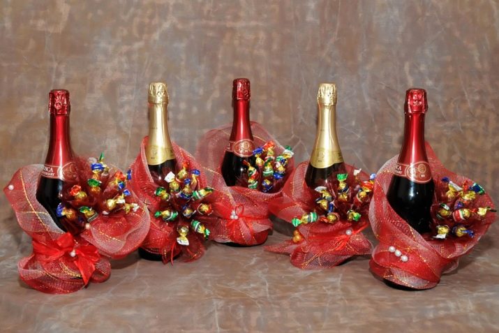 الديكور على شكل حلويات هو الأكثر قبولًا ، لأن العطلة الرئيسية مرتبطة بها. يمكن تقديم الشمبانيا المزينة بالحلويات للعام الجديد ليس فقط للأقارب والزملاء ، ولكن أيضًا للمعلم والطبيب وحتى الرؤساء. مثل هذا الهدية سيسعدهم بالتأكيد وسيصبح زخرفة أصلية للمائدة. الميزة الرئيسية لهذا الخيار هي أنه يجمع بين عنصرين في وقت واحد: الشمبانيا والحلويات ، لذلك يمكن أن تصبح هدية مستقلة وإضافة إذا كنت تخطط لمنحها لشخص عزيز على قلبك..