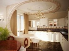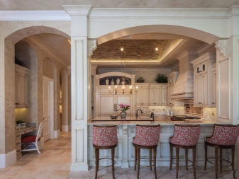 الأقواس قادرة على نقل النظرة بسلاسة من غرفة المعيشة إلى المطبخ. علاوة على ذلك ، كلما اتسعت الفتحة المقوسة ، يجب أن يكون هناك تناغم أكبر في ألوان وأسلوب الغرف المجاورة. لتقسيم غرفة الطعام والمطبخ إلى أجزاء وظيفية ، أقواس رومانية ، بالإضافة إلى هياكل على شكل “حديث” و “رومانسي”.