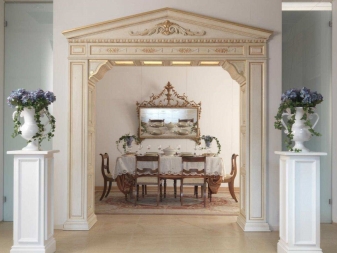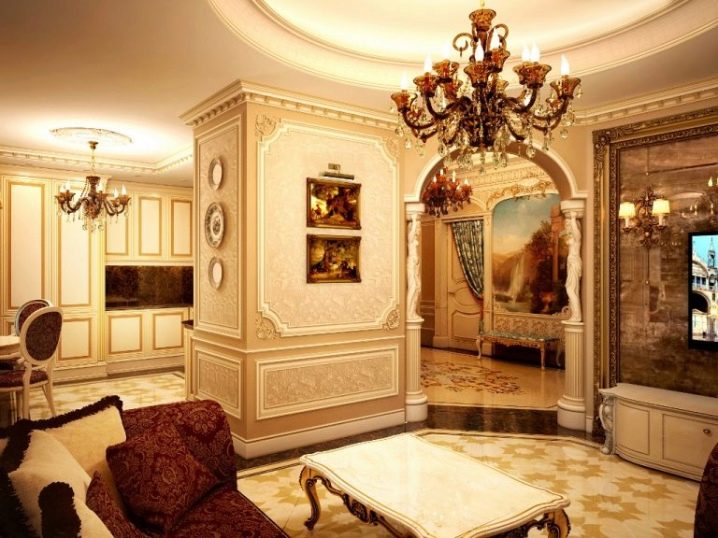 في الشقق المكونة من غرفة واحدة ، من المناسب إنشاء أنماط هادئة ، بدون أبهة وروعة. الطراز الإمبراطوري ، الباروكي ، الذي يتطلب أثاثًا ذي أبعاد ، وديكورات عديدة ، على شكل لوحات خلابة ، وتماثيل ، ومزهريات وستائر ضخمة ، ستكون متناغمة في الغرف المكانية الكبيرة. سوف تنقل الأقواس ذات الشكل الكلاسيكي في الداخل الأنيق الروح الخاصة للتصميمات الداخلية الغنية للقصر. استخدمت عناصر من العصور الرومانية القديمة في البناء: أعمدة بيضاء مع الزنجار ، وحجارة رئيسية ، وقوالب من الجبس ، ورخام. الزخرفة الزهرية موضع ترحيب أيضًا في التصميم..
