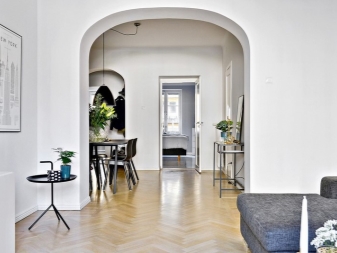 الفتحة البيضاء المقوسة الموجودة فوق الباب المستطيل هي علامة على النمط الكلاسيكي في الداخل. تعتبر الكلاسيكيات دائمًا مناسبة للمستهلك ، ولكن لا يوصى بها للشقق الصغيرة. من الأفضل أداء الجزء الداخلي للشقة على شكل استوديو بأسلوب إسكندنافي مقيد أو في بساطتها. ألوان فاتحة ناعمة ، حد أدنى من الأثاث – أفضل حل للغرف المدمجة ذات الأسقف المنخفضة.