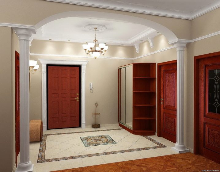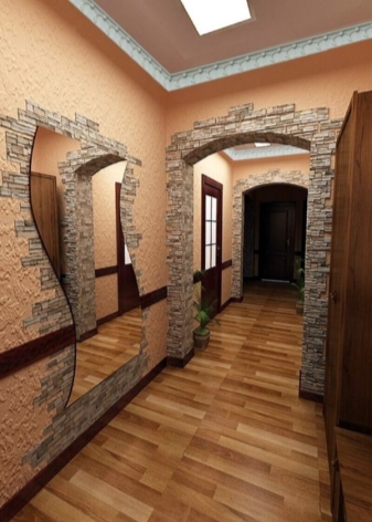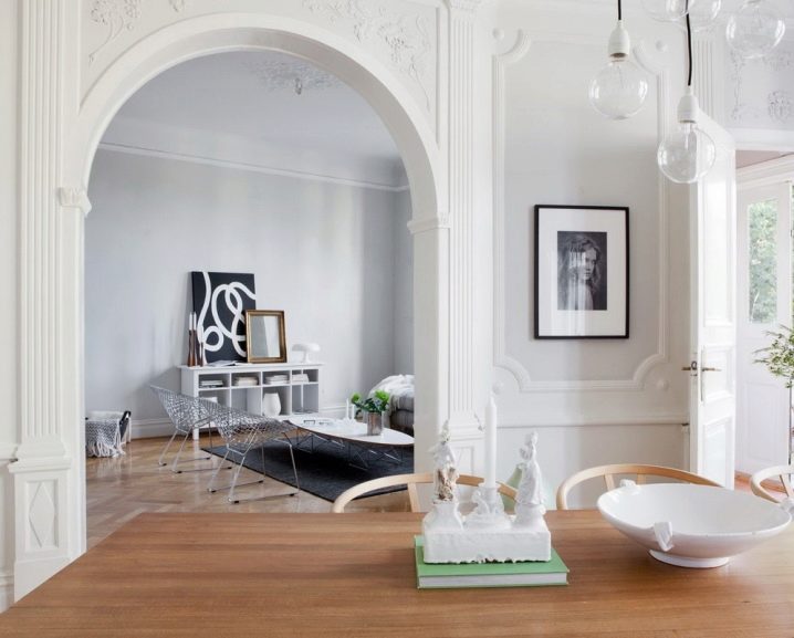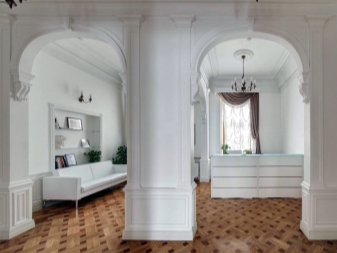 في كثير من الأحيان ، من أجل الحفاظ على النمط العام للشقة ، تم تصميم جميع المداخل على شكل أقواس من نفس النوع. هذا ليس صحيحًا دائمًا ، وفي بعض الأحيان سيؤدي إلى زيادة التحميل على الداخل. لكن فتحتين مقوستين من نفس الشكل في الجزء العلوي ، أحدهما مكمل بتكوين دريوال مقطوع بشكل مثير للاهتمام على الحائط ، يعد أسلوبًا أنيقًا للغاية..