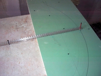 بعد ذلك ، يتم تشكيل منتج على شكل قوس من ملف تعريف معدني. يتم إجراء عمليات قطع متساوية المقاومة على طول حواف المظهر الجانبي باستخدام مقص معدني خاص وثني المنتج ، مع التركيز على قوالب الحوائط الجافة الجاهزة. وبالمثل ، يتم تشكيل اثنين من هذه الملامح المنحنية لكل جانب..
