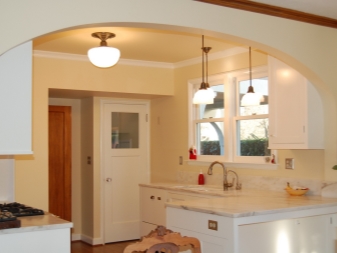 تبدو الأقواس رائعة في الغرف ذات فتحات النوافذ نصف الدائرية. ستكمل الهياكل المقببة الأجزاء الداخلية التي توجد بها أبواب ذات سقف نصف دائري. تستخدم الفتحات المقوسة ليس فقط في غرف المعيشة والممرات. مساحة المطبخ مزينة أيضًا بأقواس. هنا لن يكونوا بمثابة عنصر زخرفي فحسب ، بل يقومون أيضًا بدورهم الوظيفي (أنظمة التخزين ، والمنافذ على شكل أقواس).