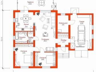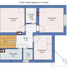 ماذا سيكون في مثل هذا المنزل: ممر واسع إلى حد ما ، وغرفة نوم ، ومطبخ واسع ، وحمام ، ومرآب ، بالإضافة إلى غرفتين أخريين ، وربما حمام إضافي وغرفتي مرافق. في بعض الأحيان في مثل هذه المنازل ، تم تجهيز غرف البخار مع غرفة ارتداء الملابس أيضًا. تبلغ المساحة الإجمالية للمنزل 100 م ، ويأخذ المرآب حوالي 16 م.
